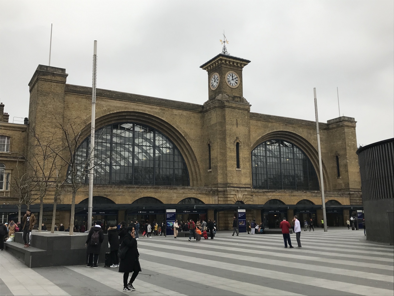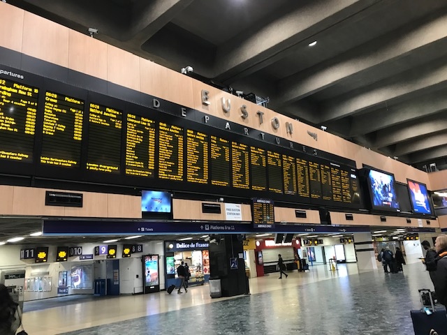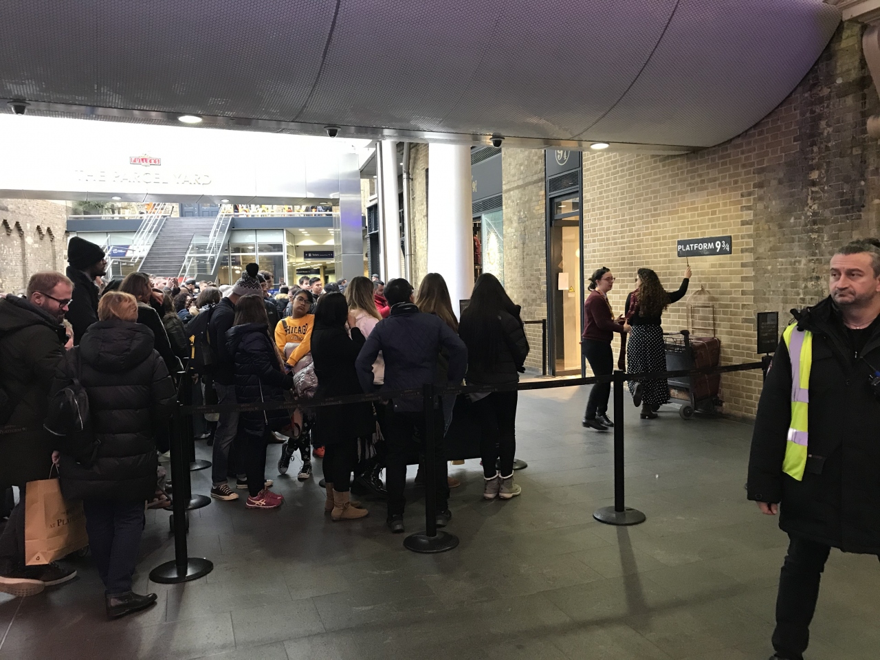 実際に列車に乗ったわけではなく、改札の外にある 9と4分の3番線を見に行くのが目的でした。カートが壁に半分吸い込めれているよう様子を表していました。長い行列ができていて、人気の高さを改めて感じました。横から写真を撮ろうとして近づくと、警備員に止められます。