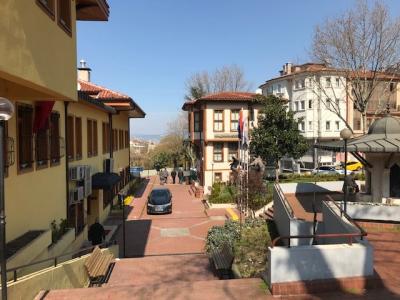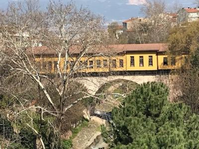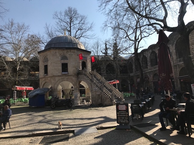 ブルサの見所のウルジャーミーからもう一つの見所のイェシルテュルベとイェシルジャミーに向かってい歩いて行く途中にあります。橋自体は珍しいモノではありませんが、川の下流側にイルガンディ橋という名の石橋がかかっていて、その橋の上に建物があります。この様に橋の上に建物があるのは世界でも3つぐらいしかないそうです。また近くには黄色の建物がいくつか建っていて、ブルサにいくつか有る隊商宿