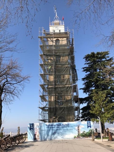 オスマン廟とオルハン廟がある公園です。オスマン廟とオルハン廟の奥の方にこのブルサの時計台がります。他で見るのと違った形の時計台で興味を引きましたが、工事中で覆いが被さっていてそのものずばりを見ることができませんでした。この公園は高台にあるので、ここからブルサの街の全景を見ることができます。