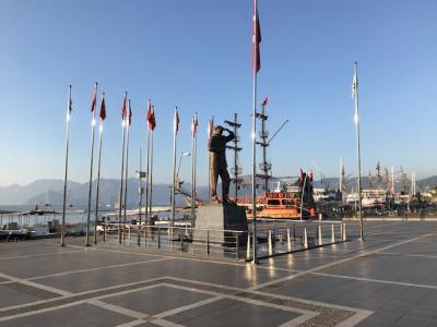 トルコのリゾート地のマルマリス の海岸沿いの太い道路が交わる場所にある公園に建っています。トルコ共和国建国の父のアタチュルク像で、トルコ各地で銅像が建っています。手をかざしてどこか遠くを見ている姿で、こんな姿の銅像は見たことありませんでした。周りは国旗で囲まれています。