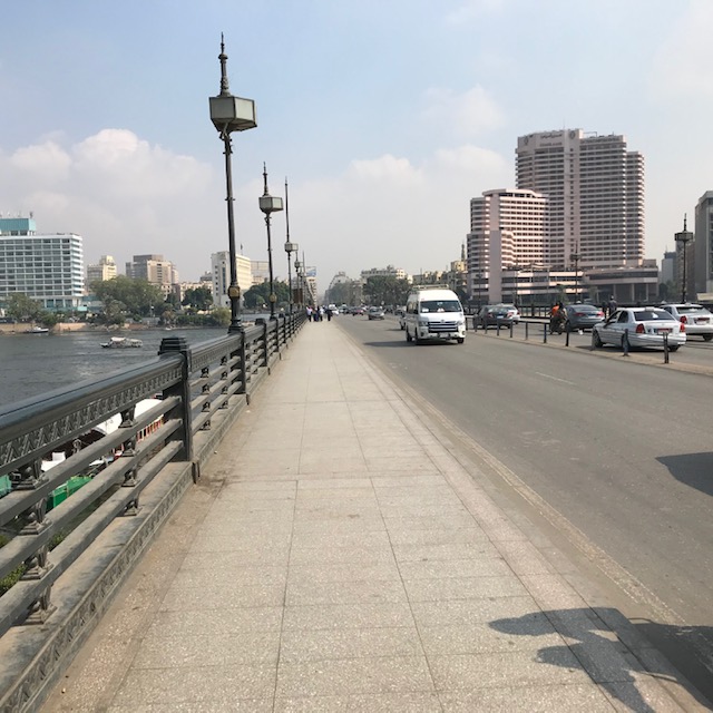 カイロ観光でゲズィーラ島の中にあるノボテル カイロ エル ボルグ ホテル に宿泊しました。ここからタフリール橋とも呼ばれるカスル アン ニール橋を渡って対岸にあるエジプト考古学博物館まで歩いて行きました。橋のたもとには黒いライオンの像がありました。歩道があるので安全に歩けます。