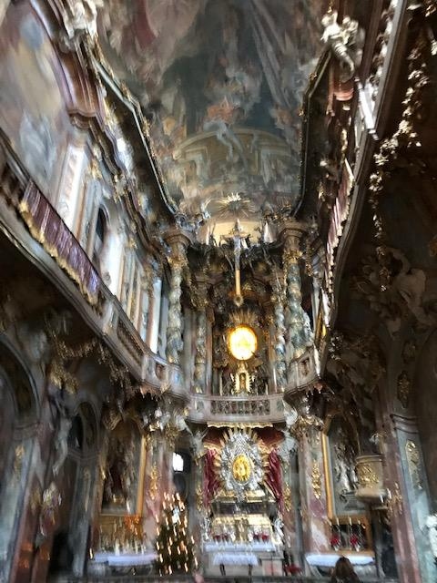 ノイハウザー通りから少し中に入ったところに建っていますが、2本の高い塔が遠くからも見えます。天辺が玉ねぎのような塔が2本あるのですぐに見つけられると思います。近くに寄って見ると右側の塔が修理中で、正面からは教会内に入れず、横の入口から入りました。教会内は意外とシンプルな造りでした。