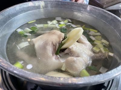 既に火が通っている鶏をハサミで切ってもらい、タデギとマスタード、お酢、醤油で好みの味の漬けダレでいただきます。スープがどんどん深い味になった頃に追加のカルグクスをオーダー。たまりません!