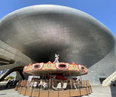 東大門歴史文化公園駅直結のランドマーク的建物。方向音痴の自分にはこの建物が目印になり有難いです。ファッションショーなども行われるそうです。韓国ドラマの撮影でも使われていましたよね。ちょっとしたショップもあり。今回はメリーゴーランドも出没していました。現地の方の待ち合わせでも使われているようです。