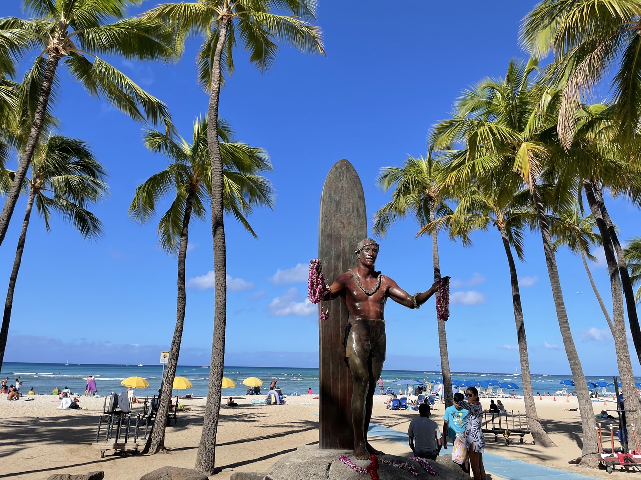 所謂ワイキキビーチを歩くと人だかりのある場所。いつもレイに囲まれているハワイ伝説のサーファー、オリンピック金メダリストが の銅像です。撮影スポットです。カラカウア通り沿いなのですぐにわかりますよ。ここに来るたびハワイに帰ってきたなーと思える場所です。
