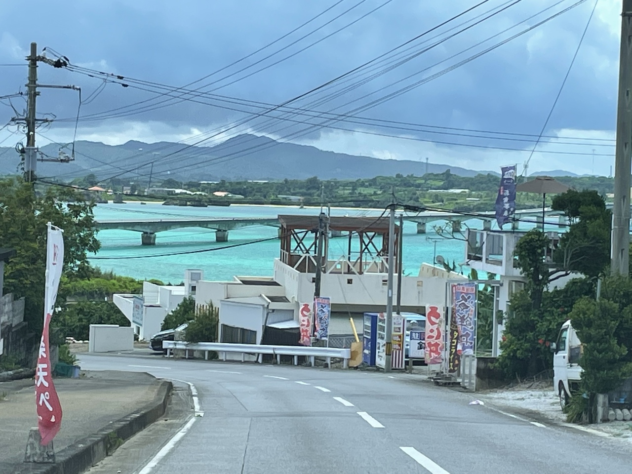 車でノンストップだと20分かからないほどで一周できる小さな島です。名護周辺から海沿いでなく中突っ切って行くと30分くらいで到着です。坂が多く街の上からみる海は絶景でした!カフェや食事できるところも結構あります。