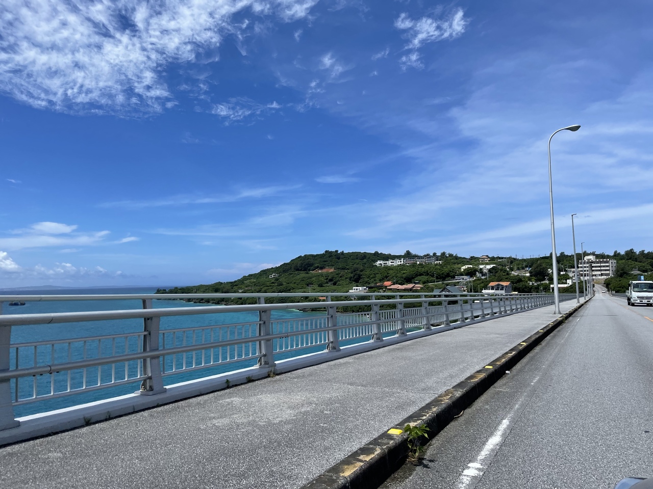 瀬底島に行くのにこの橋を渡ります。絶景ビーチへの入り口ですね。橋は長くないですが、晴れた日に渡ると青い海が見えて気持ちいいです。橋自体をみるなら島へ渡る手前にイオンがあるのでそこから見ると綺麗にみえますよ。