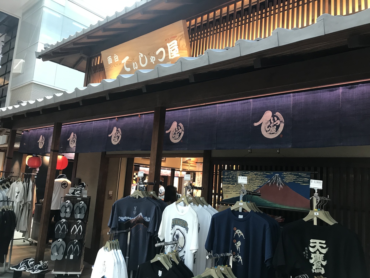 日本語で文字が書いてある、Tシャツがたくさん売っています。