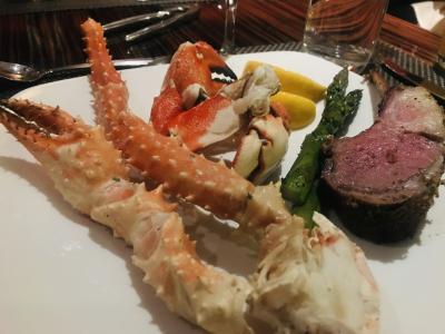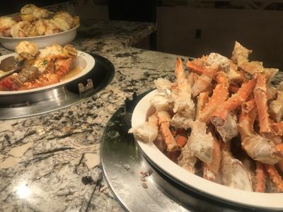 まず、高級シャンパン (この時はペリエジュエでした。)が飲み放題。バフェとしては、食べ物メニューが少ないですが、キング・クラブ、ストーンクラブ(この時点で価格の元は取れるかと…)、ロブスター、ラム、キャビアなどなど。たまの贅沢にはもってこいです。