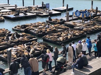 ピア 39 に行く目的の1つとしてここのアシカ見物が入っているのではないでしょうか。冬場には数が少なくなりますが、それでも何頭かはみれると思います。ピア39を入って奥の右手を通るとあります。イカダに乗る野生のアシカの愛らしい姿は見ていて飽きません。この場所から晴れていればゴールデンゲートブリッジ、アルカトラズ島も綺麗に見えます。