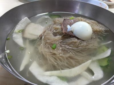 ホテルのすぐそばにあったので入ってみました。駐車場があることもありとにかく凄い行列。地元の人ばかりでした。頼んだのは普通の冷麺とマンドゥ半分(3個入りも頼めます)。