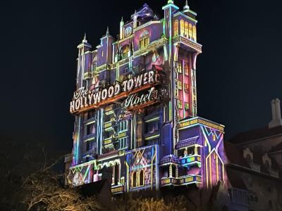 東京にもありますが、ここが本場というか先にありました。フリーフォール系のアトラクションなんで落ちるの苦手な人には恐怖ですが、日本版より落ちる回数も多めだし、ストーリーが違います。一瞬みえるパークの景色も楽しみながら乗ってみてくださいね。50周年の限定なのかな?日暮れからはプロジェクターマッピングを使ってデコレーションされていました!