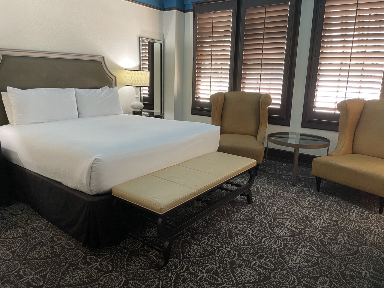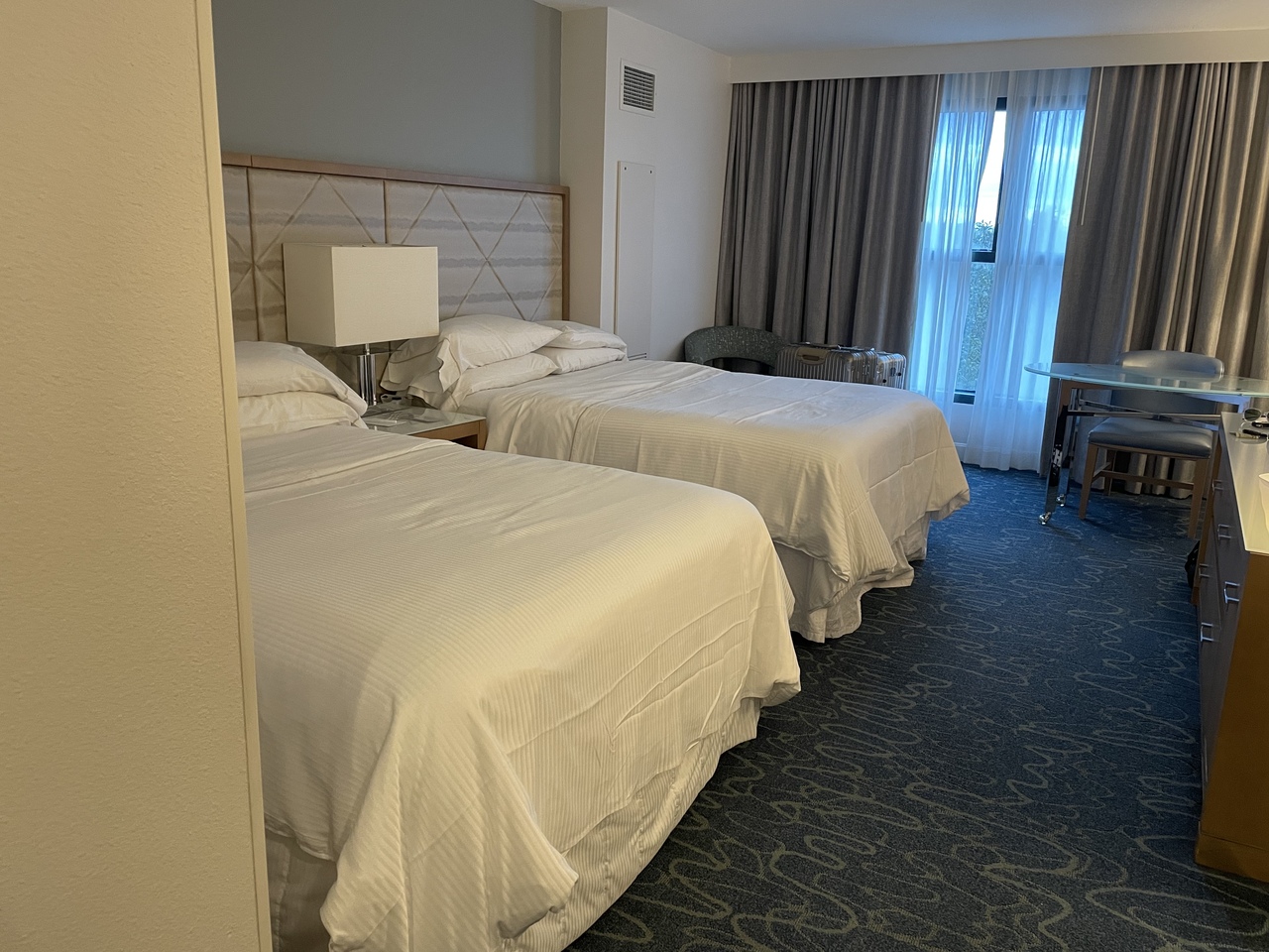 ディズニーボードウォーク、エプコットへは徒歩でも行けます。少し遠いけれど、ハリウッドスタジオへも。直営のバスはないですが、パークれ行くパークシャトル、エプコット、ハリウッドスタジオへはホテルからボートも出ていて、混んでいるシャトルに乗るより便利かも。(エプコットへは歩いた方が速い)フロントの方もフレンドリー、古いホテルですが、手入れもされていて部屋もスーツケース広げても余裕があり心地いいです。毎日ペットボトルの補充ありでした。ホテルのレストランは比較的高級な感じの店が多く)ドレスコードありのステーキ店とか)コストを抑えてたいならば、ボードウォークにあるマート的なお店がおすすめです。