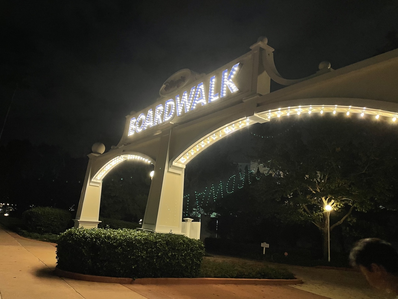 レストランやショップがあります(数はそれ程ない)この近辺に宿泊したら食事などに利用するといいですね。クラブ(踊る方)もありました。時間を合わせると少しですがエプコット(多分)の花火もチラッと見えます。わざわざ行くかというと行かないかもですが、マート?コンビニの少し大きなの?が遅くまでやっていたので少し足りないものを買うのに便利でした。- 旅行時期