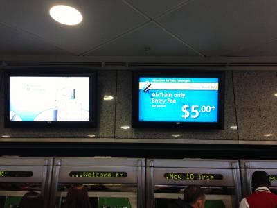 JFKからエアトレイン(空港内を走るモノレールみたいなもの)の料金が$5。ここからマンハッタン方面に行く地下鉄に乗るのは$2.5。ここで両方の料金を払います。