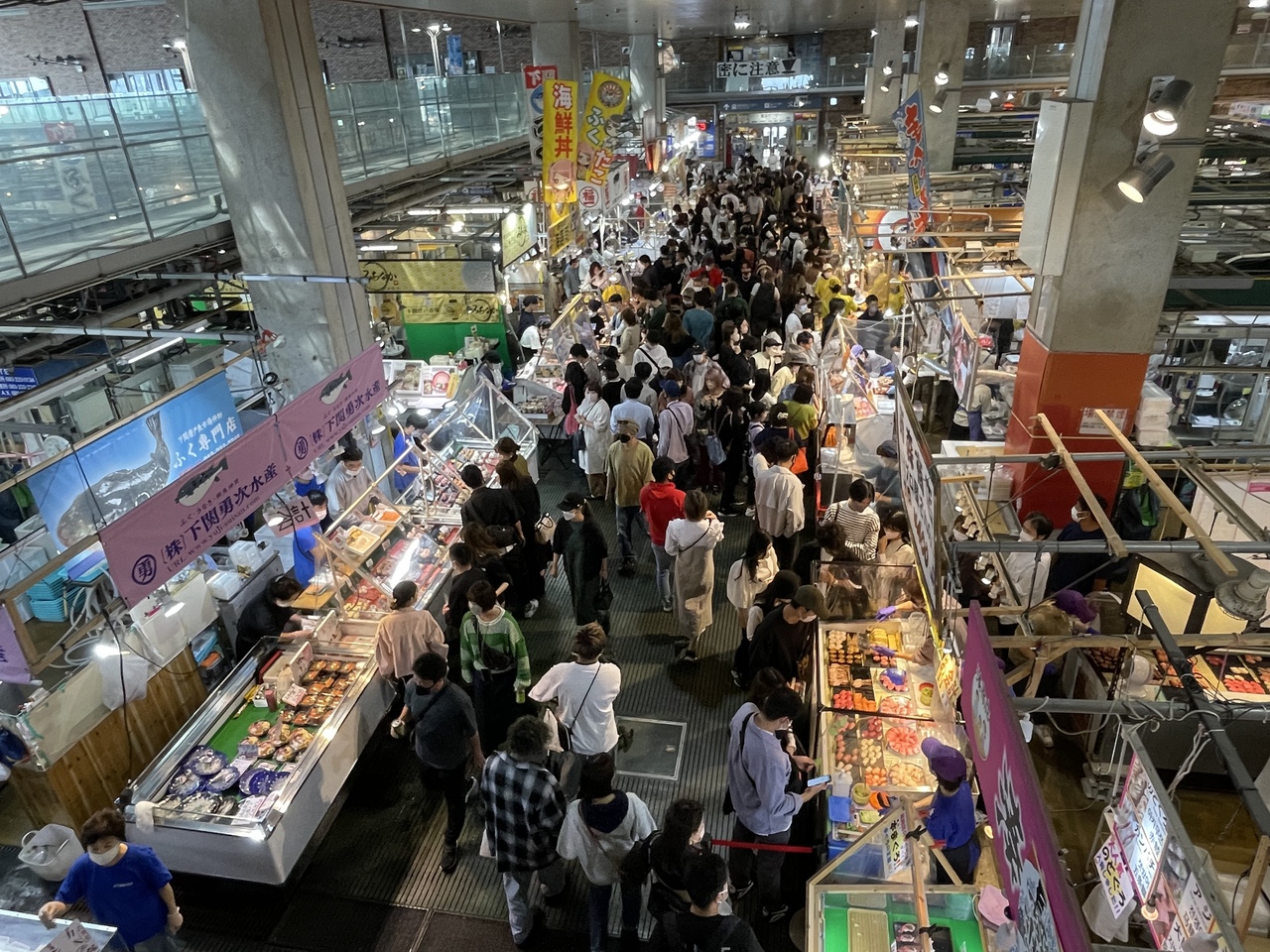 平日は市場ですが、金曜から日曜までは観光客で賑わっています。市場として鮮魚の買い物もできるし、出店みたいな感じで新鮮な鮨や海鮮丼を売っているお店がたくさん並んでいます。特に握り鮨のバラ売りは価格だけ考えると激安では無い様な気がしますが、新鮮さやネタの大きさ考えるとかなり満足できると思います。下関に行った時には必ずここでブランチを楽しみまーす。お店によってネタや大きさも違うのでお気に入りをみつけてくださいね。