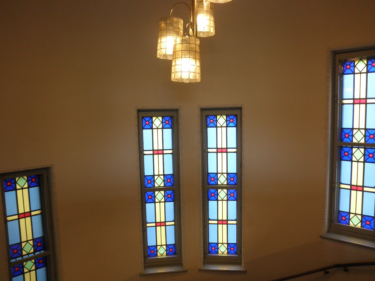 外観は裁判所の面影を残し、中のステンドグラスや手すりも趣があります。