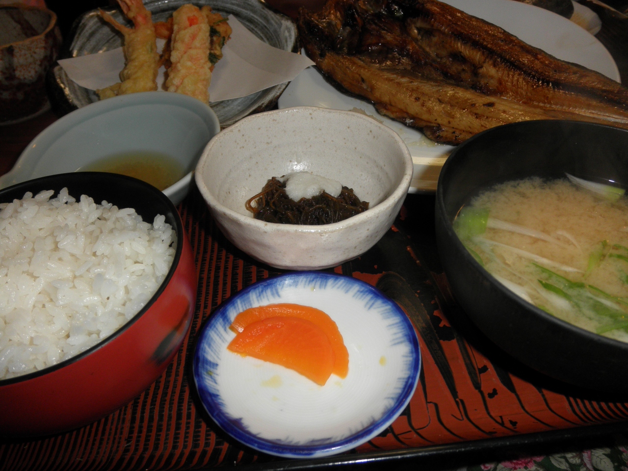 ご飯と出汁のきいた汁物、メインの魚料理、小鉢(小鉢ではなく中鉢の大きさ)で、大変なボリューム!