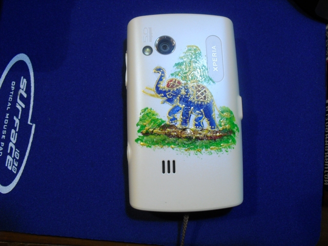 チェンマイ郊外のボーサンにふらーと出かけてみた。入り口のカルチャーセンターでは傘やTシャツにお好きな絵を描いてくれることで有名、久々に覗くと携帯電話に絵を入れてくれる。気分転換にと思い、私も頼んでみた。象の絵・小さいやつ、50B。10分程で出来上がり。- 旅行時期