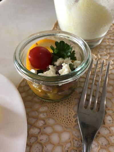 MuliaVillasのLivingroomでの朝食。小皿料理を持って...