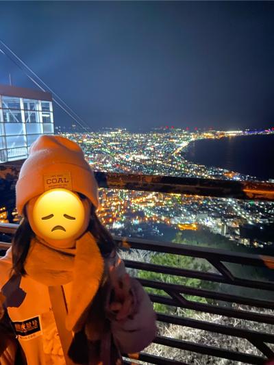 函館の夜景をバックに娘を撮影。なんか本人、全然楽しくなさそうな無表情な...