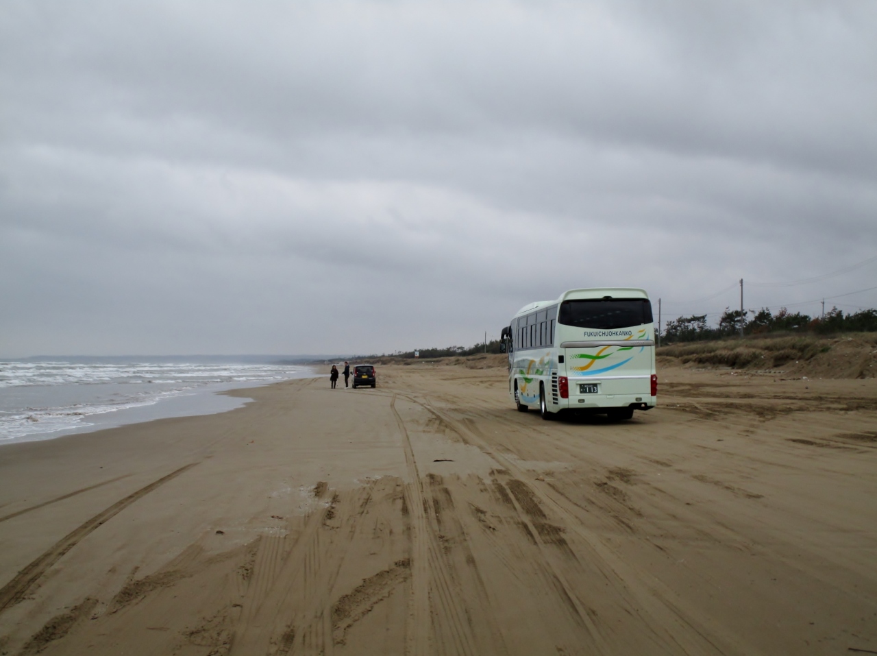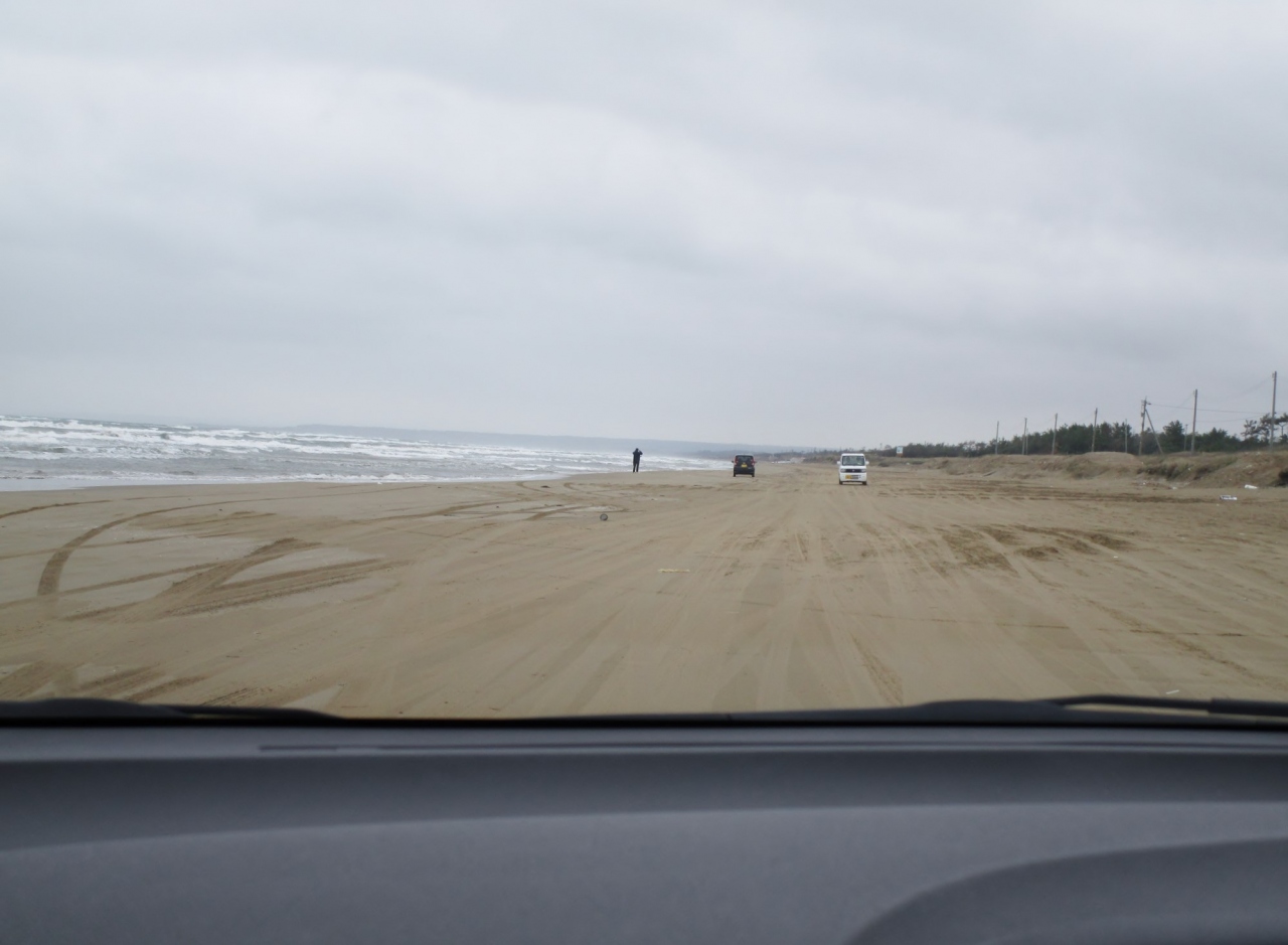 確かに、海岸を車で走ったことはありませんでした。それが普通にできるところです。砂が細かいので地面はしっかり締まっていますが、それ以外の所に車で入るのは危険とのことです。天候が悪く、波が高いと通行禁止になります。その場合は、のと里山海道の電光掲示板でその旨のお知らせがあるそうです。