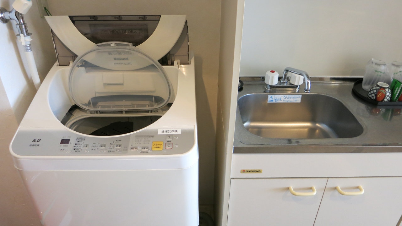 お部屋に洗濯機があって、簡易キッチンもツインならついてます。