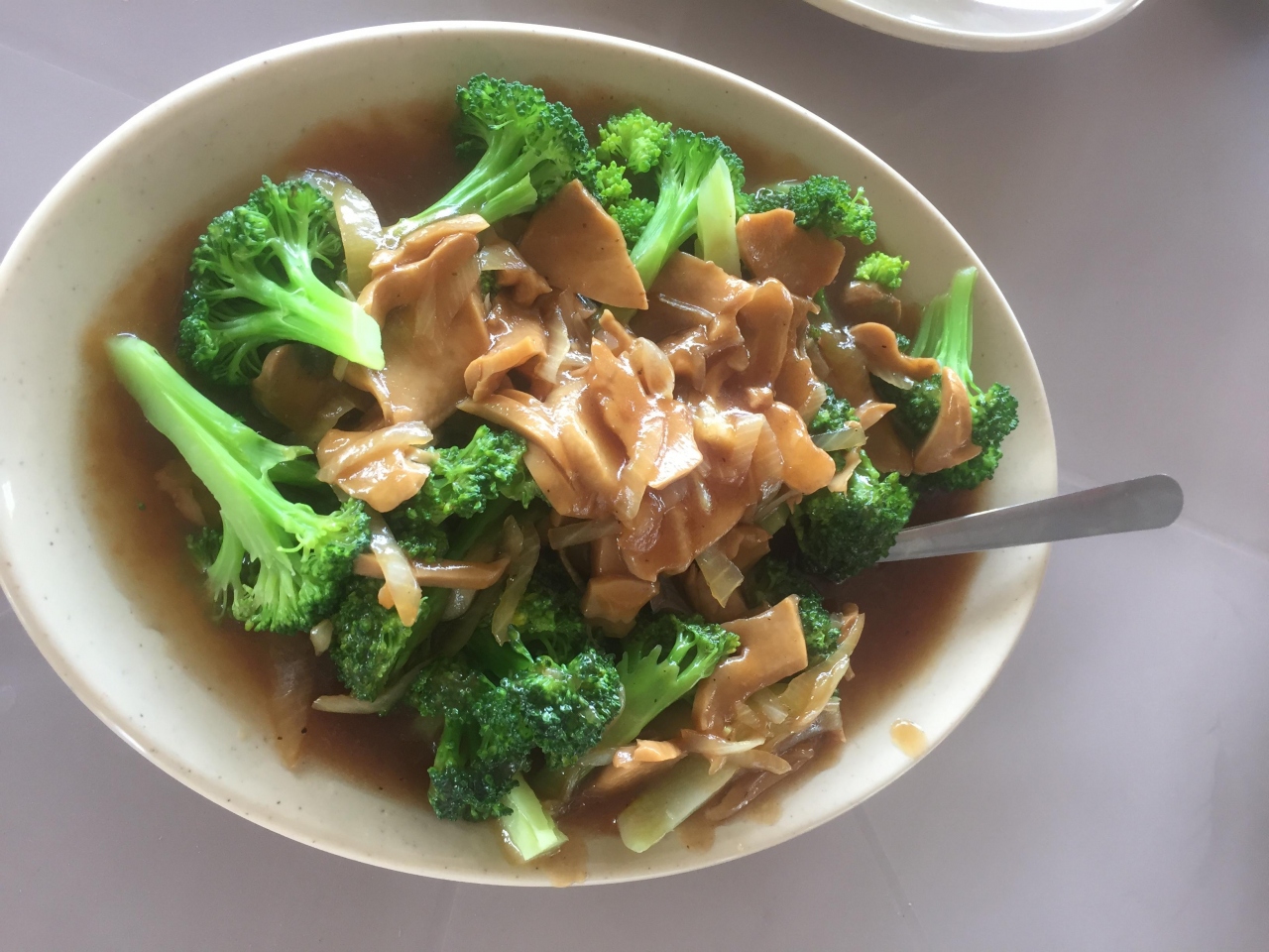ブロッコリーいためはオイスターソースベースで甘く、マッシュルームたっぷりでとてもおいしかったです。