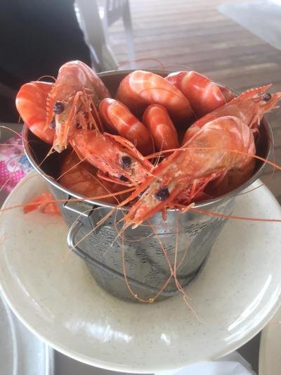 3人でバケツに入ったエビ、ブロッコリーの炒め物、シーフードピザ、ビール2本とコーラ、紅茶を注文。