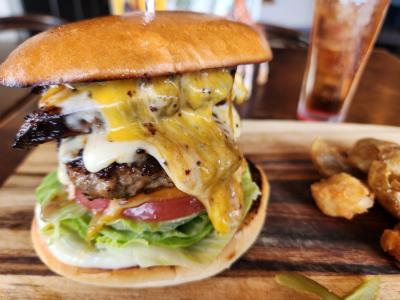 出てきたバーガーはかなりの高さがあり、いつものようにペーパーにくるんでつぶしてみても全然つぶれない(汗)仕方がないので席に置いてあったフォークとナイフでいただきました。女性にはかなり厳しい高さじゃないかな...。(ここは個人的な口のサイズの問題なので大きく口が開けられる方は問題ないかも)肝心のパテは、かなり筋が残っていて噛み切れない...ベーコンも。肉々しい感じは好みなのだけど、噛み切れないのはちょっと辛かった。食べ終わる頃には顎が疲労困憊(笑)