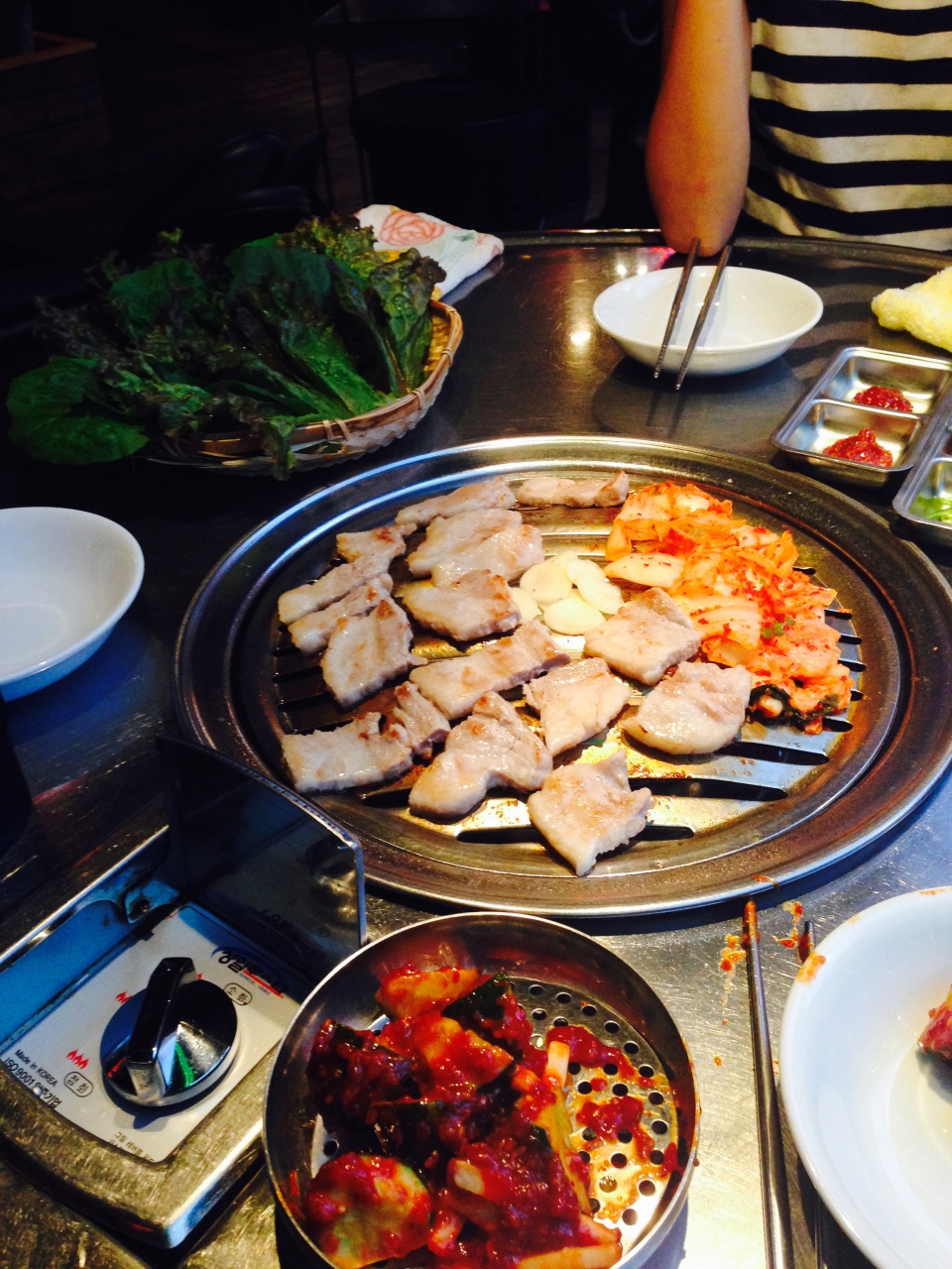 お勧めはサムギョプサルチシャ菜で巻いてお好みの辛さで頂きます。
