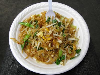 • 屋台で売られているパッタイ(タイ風焼きそば)。卵付きで80円ほど。安く...