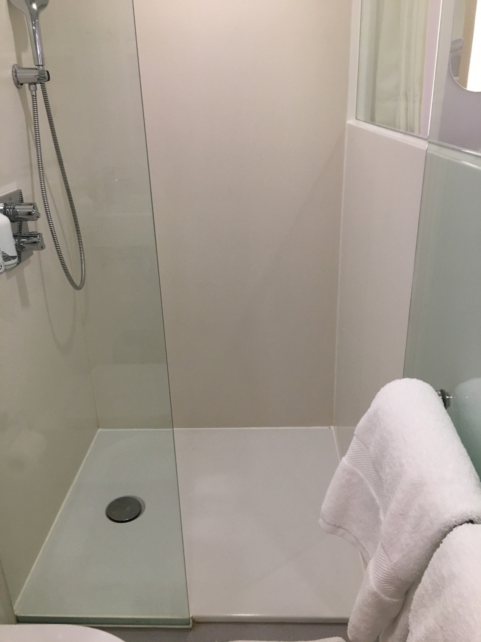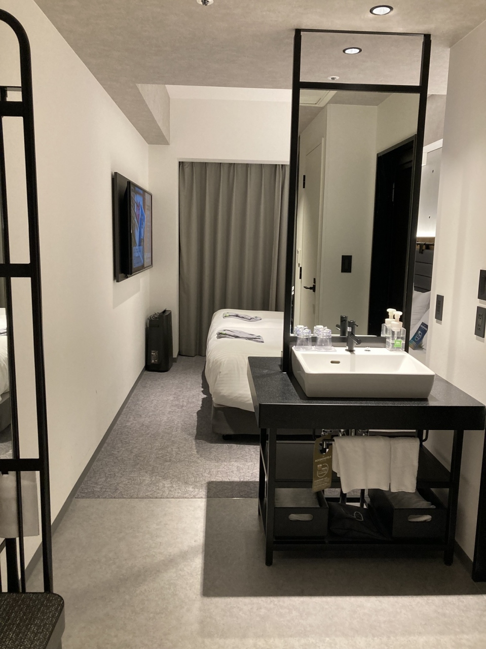 少し狭いけれど、スッキリしてて必要なものはちゃんと揃っています。ボトルのミネラルウオーターも置かれてました。