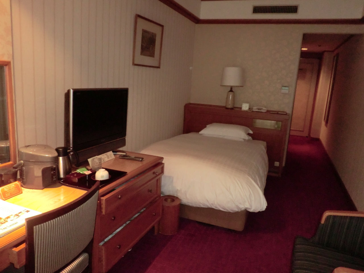 そんなに最新式の設備でもデザインでもなく、日本で言えば昭和の香り、ですが、テレビもありました(なんとNHK国際放送が見れました!)し、バスタブもあるし、ミネラルウォーターのボトルサービスも置いてありましたし。不便・不都合ありませんでした。