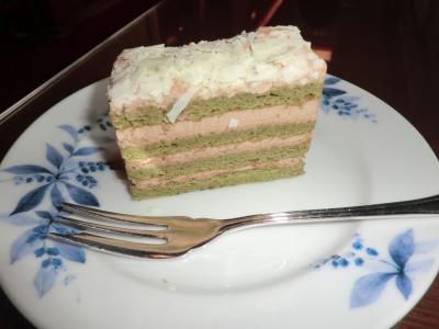 今回は抹茶のケーキ630円とグレープフルーツジュース693円(税・サービス料込)。ホントにちょうどよい甘さのチョコレートとしっとりやわらかい抹茶のスポンジ部分が幾層にも重ねられていてすごく美味しくて、宿泊しなくてもケーキだけいただきに来る価値あります。