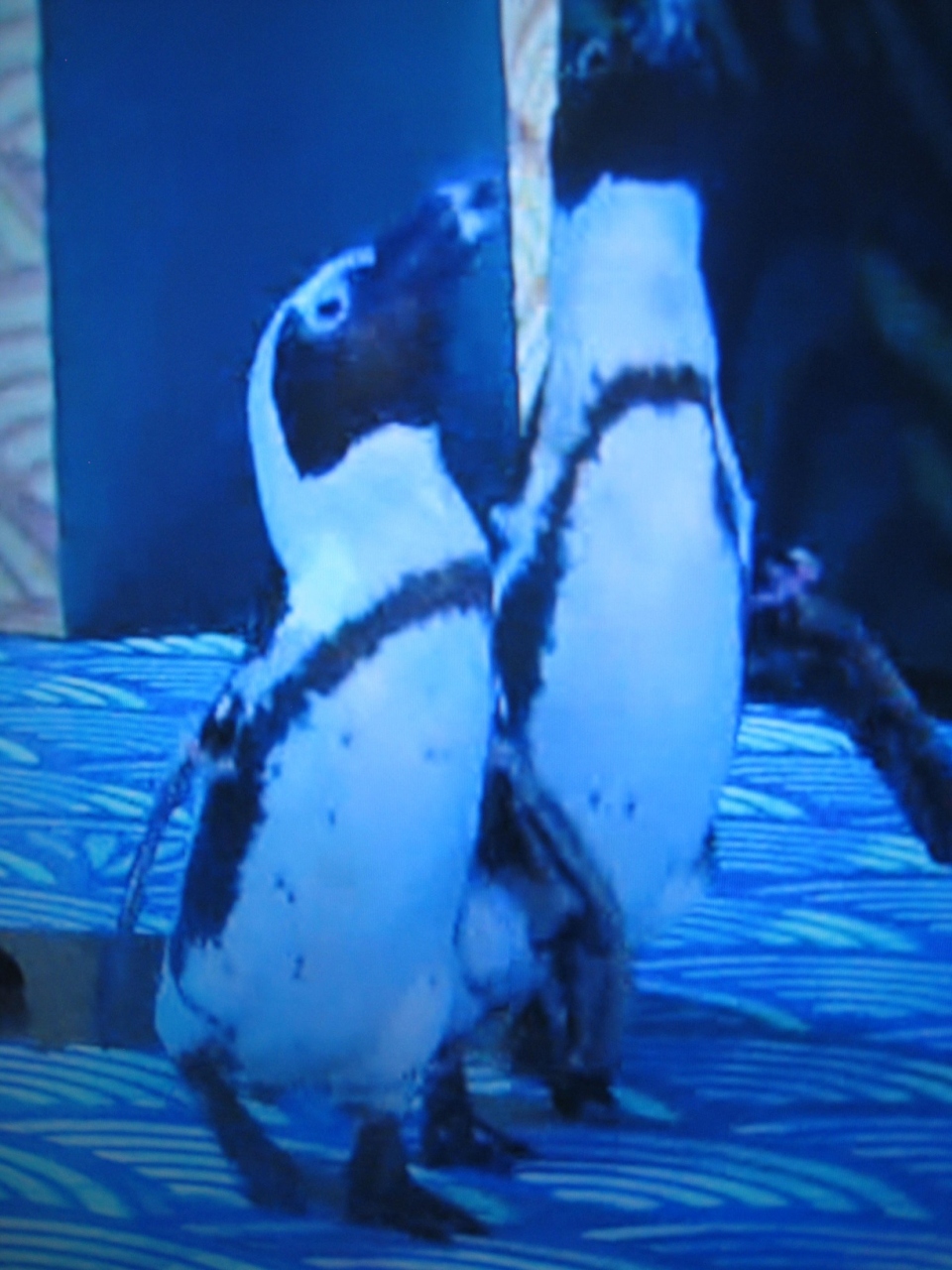 品川プリンスホテル内にある水族館で、貧弱なものではなくその規模はおおきかったです。その分混雑していて、なかなかペンギンまで近づけられず、最初は仕方なく人並のとこから撮影、しかしそれではどちらがオレンジでモモかわからないので、人並みかきわけ近くに行き撮影。