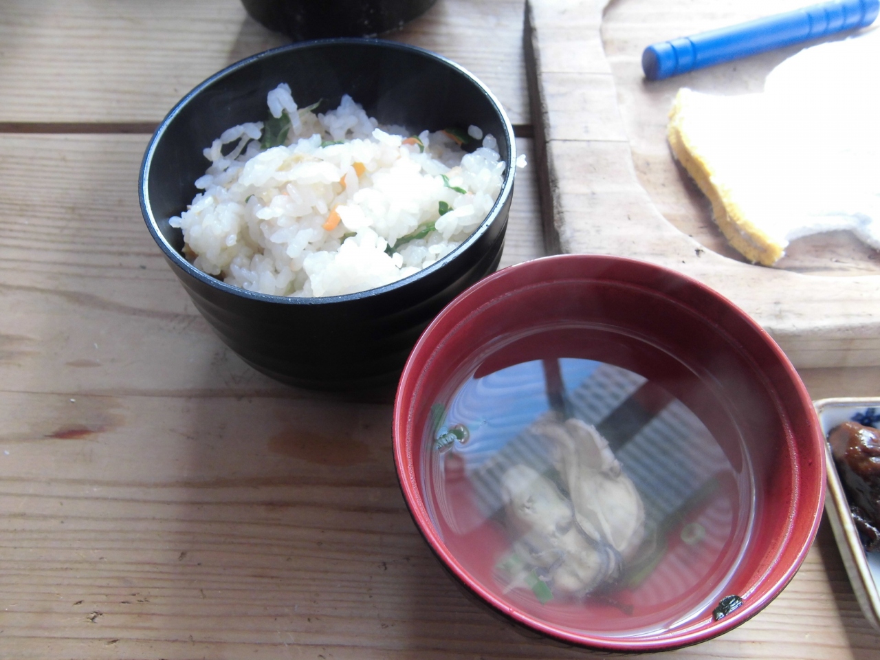 ・カキめし、カキ汁、カキ佃煮(小鉢)、カキフライ(5個)付き