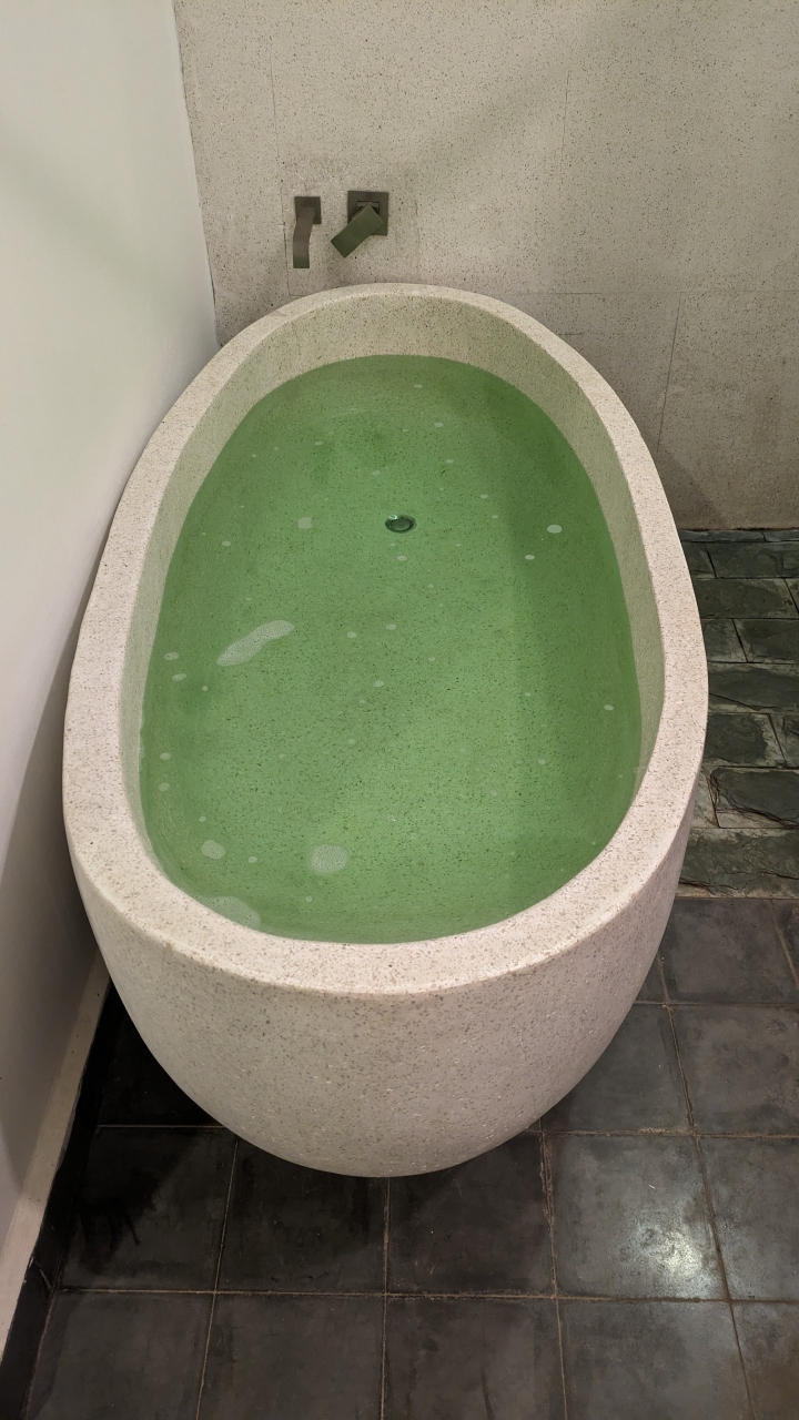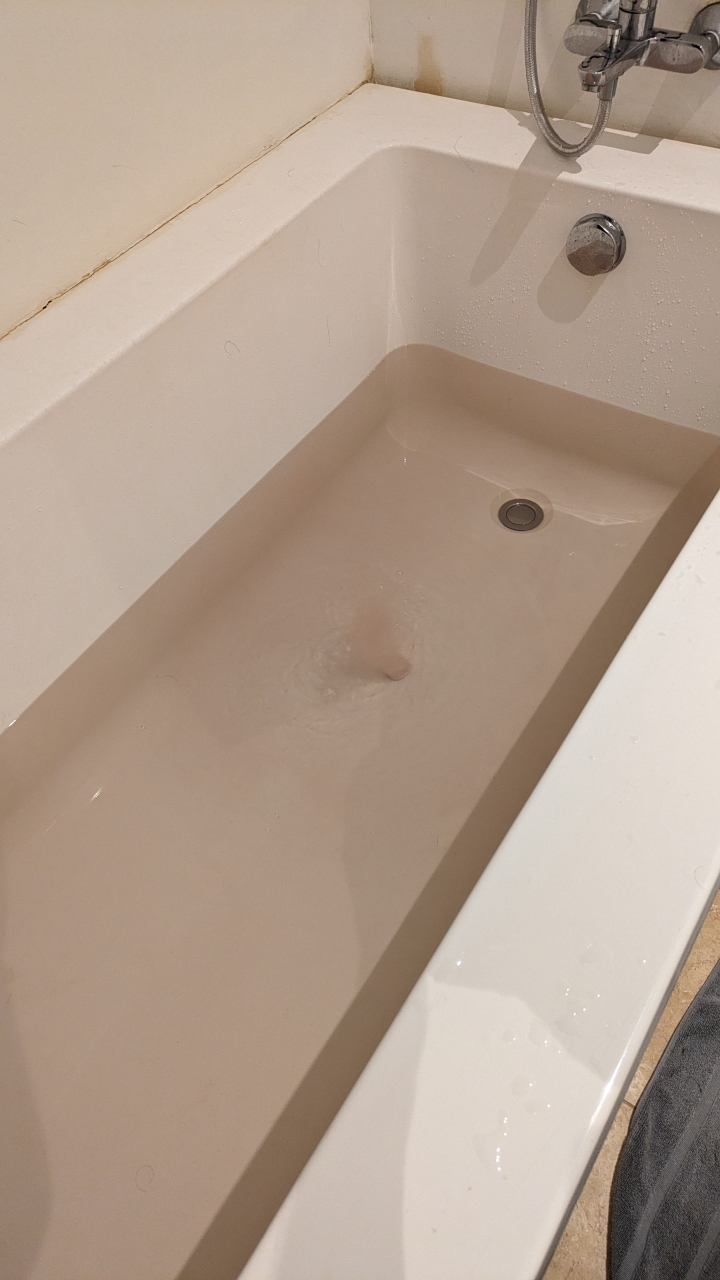このホテルのバスタブは大きめですが、給湯器が間に合わず溜まる前にお湯が切れてしまう(10分ほど待たないといけない)ので、別途電気ポットの熱湯で湯加減を調整しました。