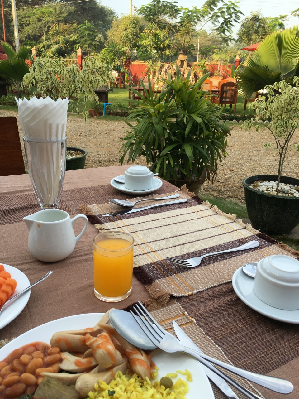 部屋待ちの間、フロント兼食堂で座っていると、マネージャーが来て「せっかくだから朝食食べてくれ」と誘ってくれました。このとき2日後の朝8時のフライトでバンコクに戻ると話したら、それなら5時チェックアウトで前日にタクシーを予約したほうがいいとのことでした。そこでチェックアウト前夜夕食後ホテルに戻ったときにタクシーの予約をお願いしたら、既に登録されていました。