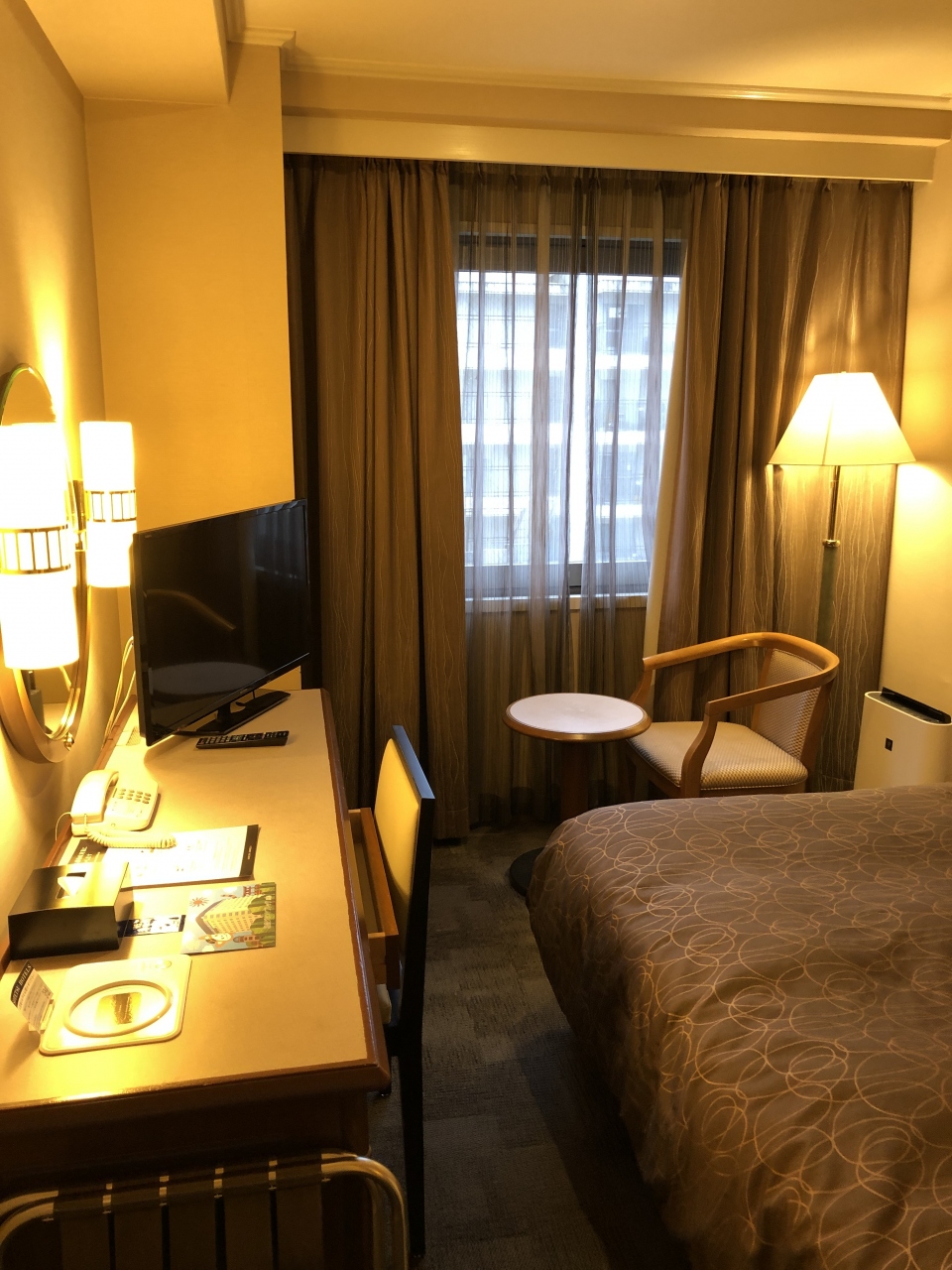 部屋は狭いが、窓際のミニデスクや荷物置きラックがあるので使い勝手がいい。