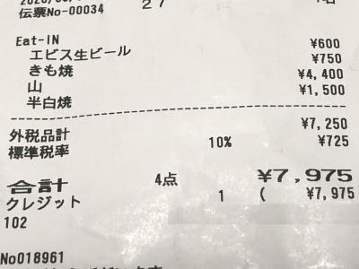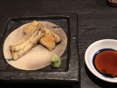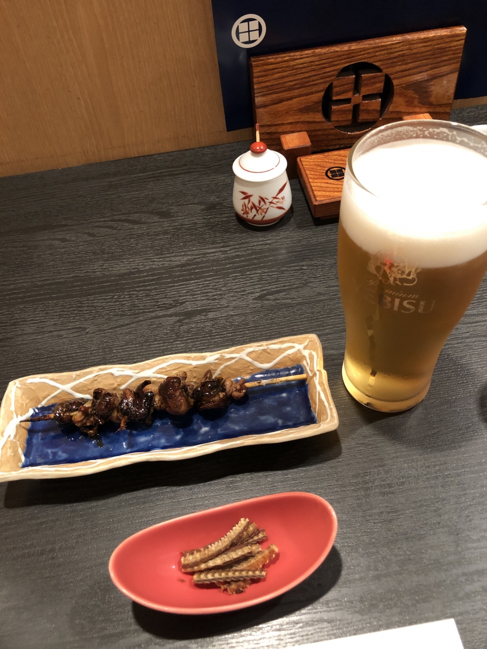 まずはエビスとうなぎの骨せんべいが、そして間を置かずに出てきたきも焼きはビールに合います。