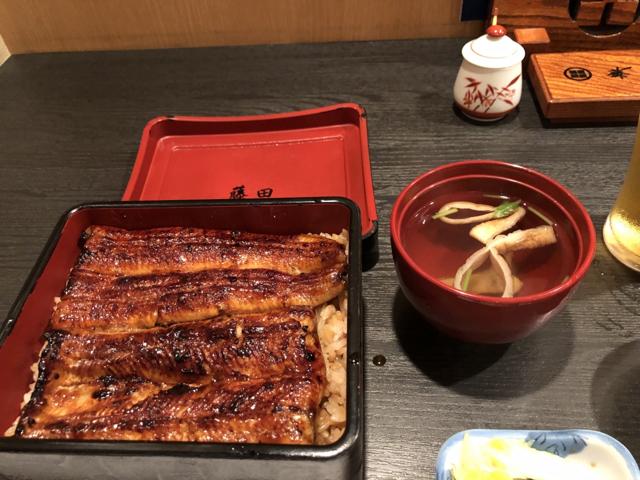 うな重(山)と半白焼、きも焼きとエビスを注文。