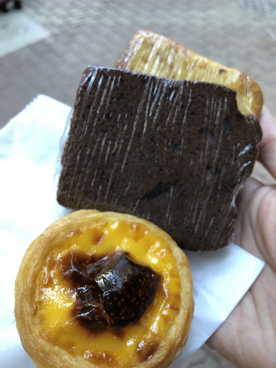 ちょうど細かいお金が20香港ドル札しかなかったので、エッグタルトと2種類のパウンドケーキも購入しました。