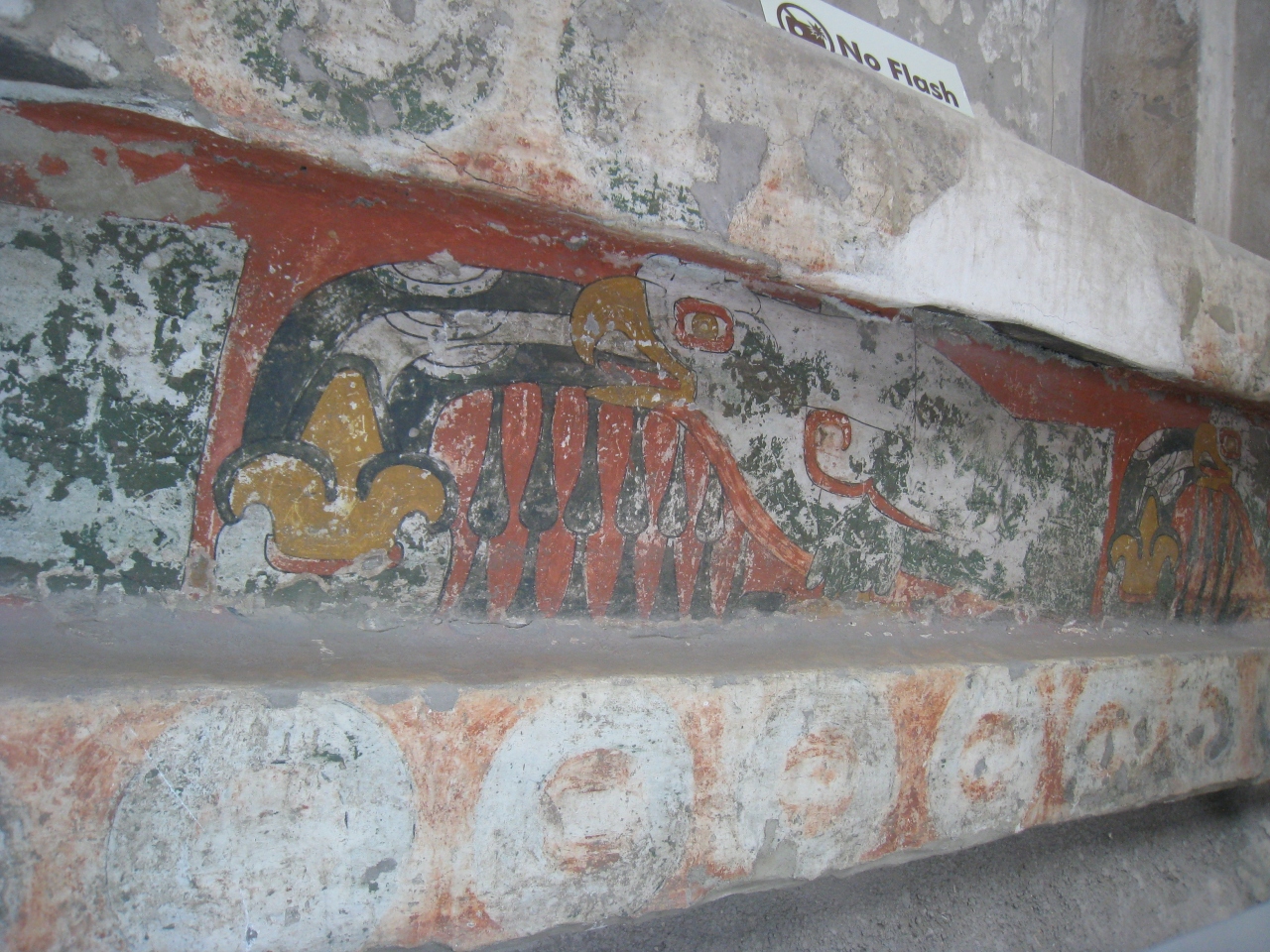 神殿の基壇部分に、鮮やかな壁画が目に留まります。