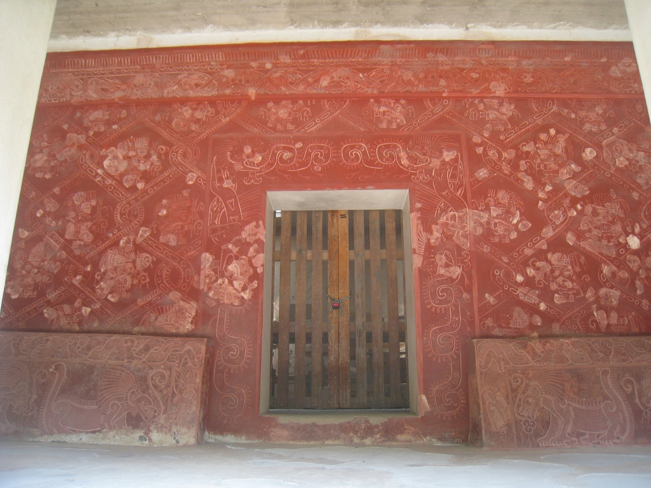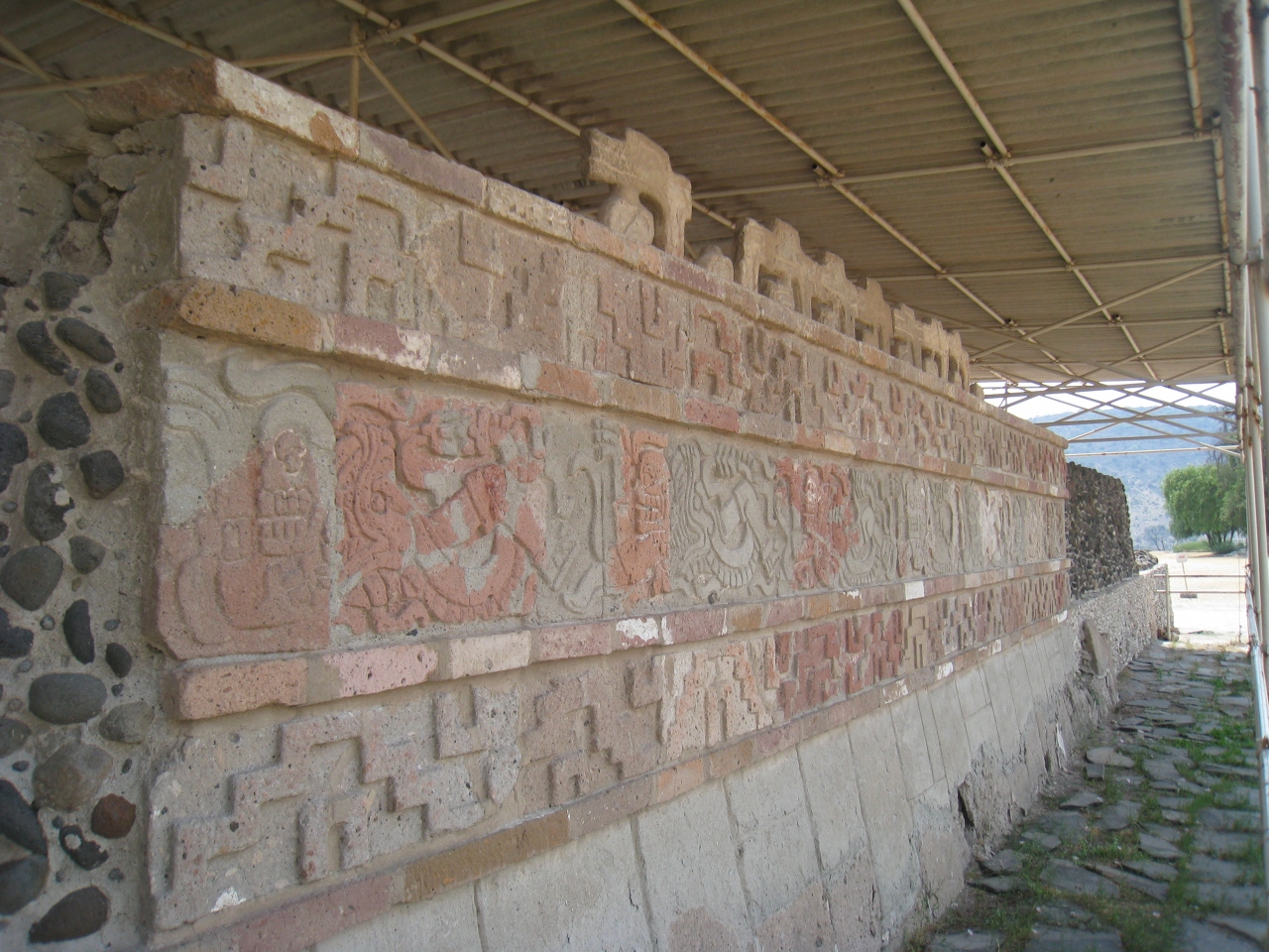 ピラミッド脇の屋根に覆われた場所には、まだまだ赤色がはっきり見える石彫があります。- 旅行時期