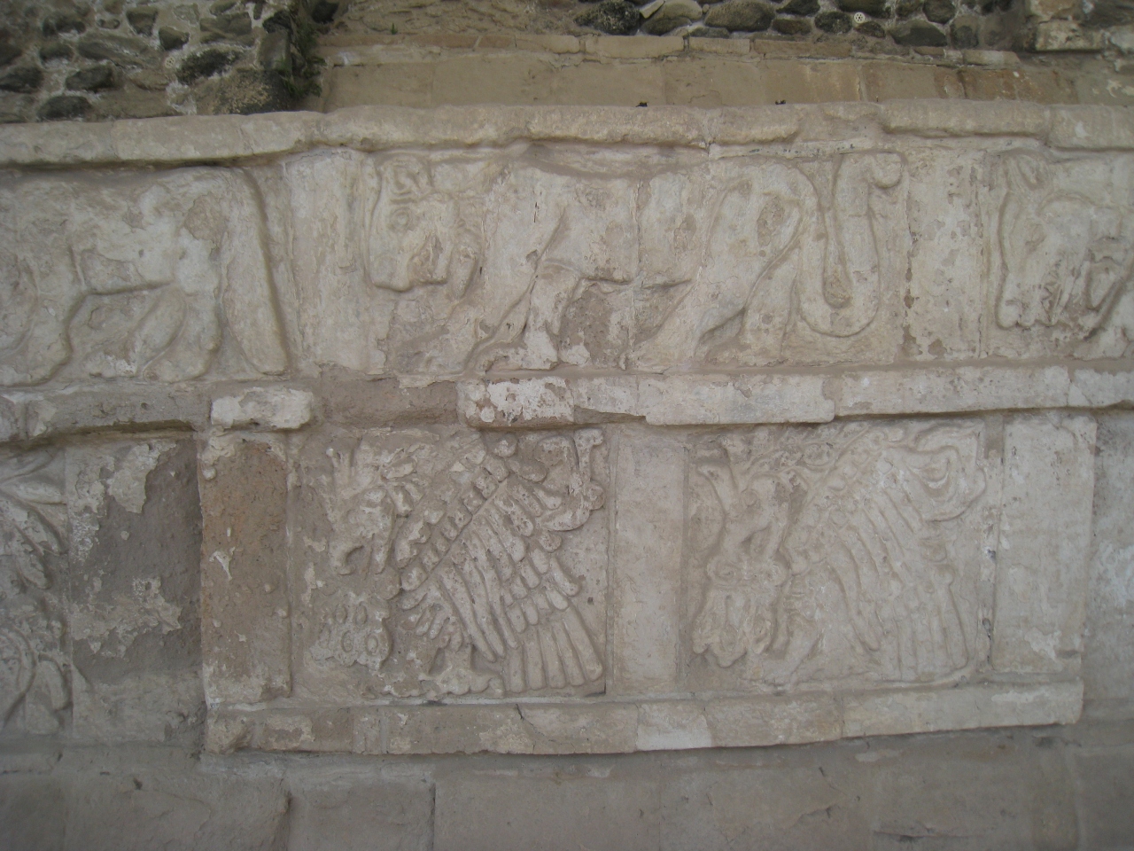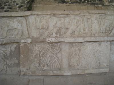 コアテパントリの右側、ピラミッドの東側の外壁にはジャガーやコヨーテ、心臓を食べる鷲の彫刻があります。