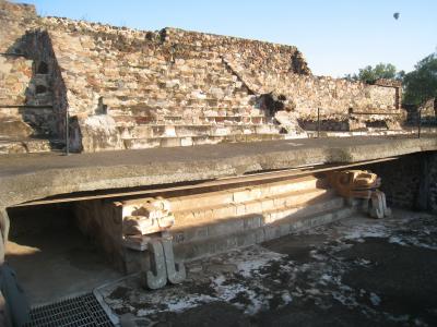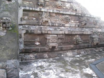 トラロックとケツアルコアトルの彫刻が交互に並び、その上下に横長の蛇の石彫があります。