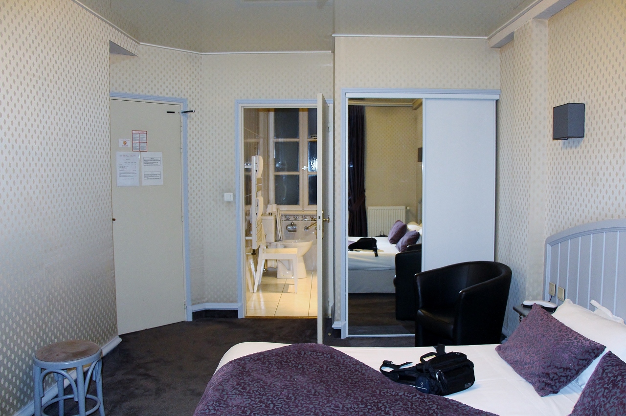 ディナンの旧市街の、すぐ前のホテルです、観光にはとても便利、部屋もトイレも洗面台も広くて、総じて部屋は広すぎるほど、建物はそれほど新しくなくて、歴史のある感じのホテルです、部屋がだだっ広いのは、そのせいかも?