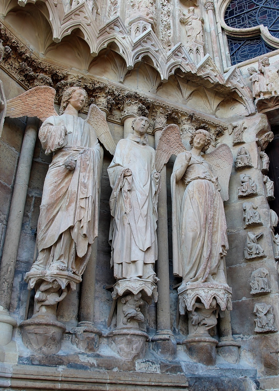 僕の印象としては、塔の格好などは、アミアンやパリのノートルダムに良く似ている大聖堂ですけれど、タンバンの彫像などは、ち密さも、独創性も、アミアンが上で、ランスは、ちょっと落ちるような気がしました、ただ、この教会の特徴としては、至る所に、天使が多くて、特に、正面扉口の、微笑の天使像は有名で、この教会独特の、独創性を感じさせます。- 旅行時期