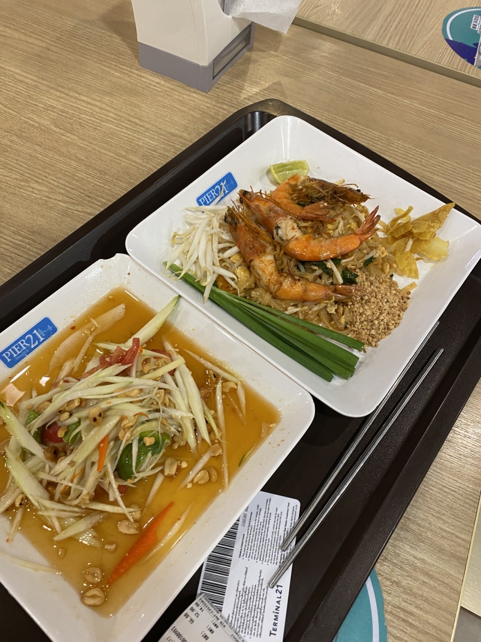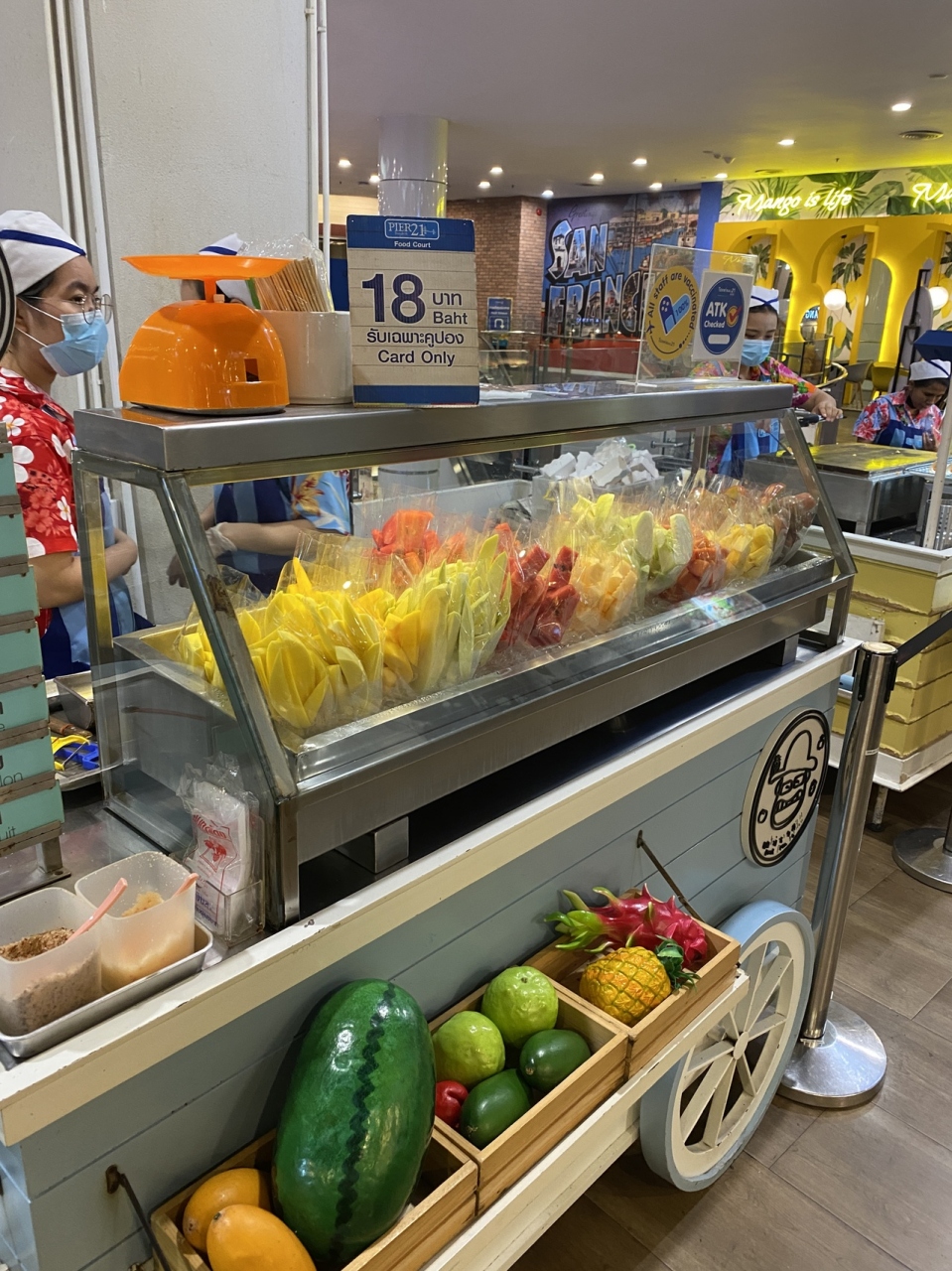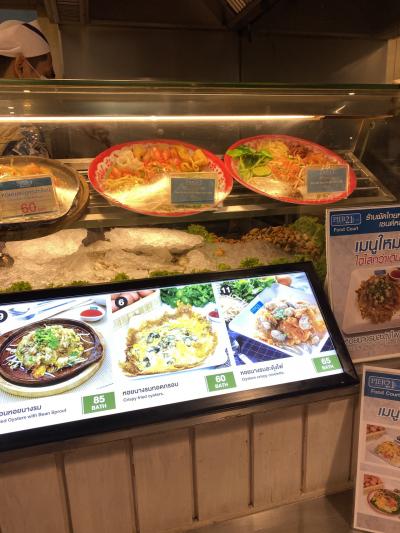 ターミナル21の5階にある、こちらのフードコート。ローカルフードが格安で食べられます。エスカレーター近くのカードを買うカウンターは、激混みなので1番奥のカウンターをお勧めします。ほとんど並ばず、すぐ買えます。はじめに、フードコートで使えるカードに任意の額をチャージして使います。残額は、返金してもらえるので多めにチャージしてもいいかもしれません。私は、100パーツチャージして使用しました。1人でソムタム、海老入りパッタイを食べて86パーツでした。これにデザートや飲み物も頼むとしたら、150パーツぐらいチャージしていると足りるでしょう。フルーツは、一袋18バーツ、飲み物は25-50パーツぐらいです。